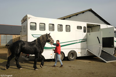 Un étalon percheron, Hashtag de la Touche à Antonin Vallée (53), et une jument gestante, Fantaisie Guinefolle à Patrick Chopin (61), ont débuté aujourd'hui un long périple pour rejoindre l'Inde.